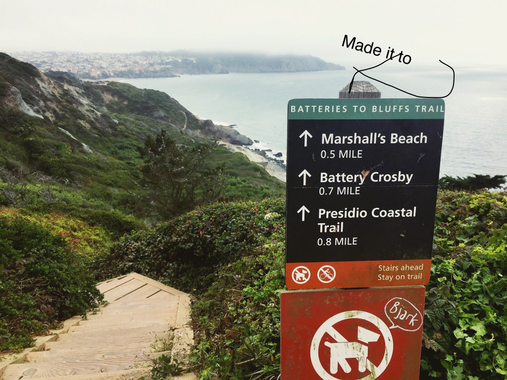 Mile 9 was all about crossing the bridge back to S.F. Mile 10 began our descent off the bridge. I felt great, but was also nervous that the excitement of the bridge was over. How would the next miles go? As I stepped off the bridge a little bit of apprehension crept in even though we were enjoying a downhill section and amazing views of the ocean. That smell of eucalyptus and cypress were back again. I’m obsessed with this smell now. Mile 11 continued on a downhill with amazing views of the water, Baker Beach and Marshall Beach. I enjoyed visiting both while exploring the day before.