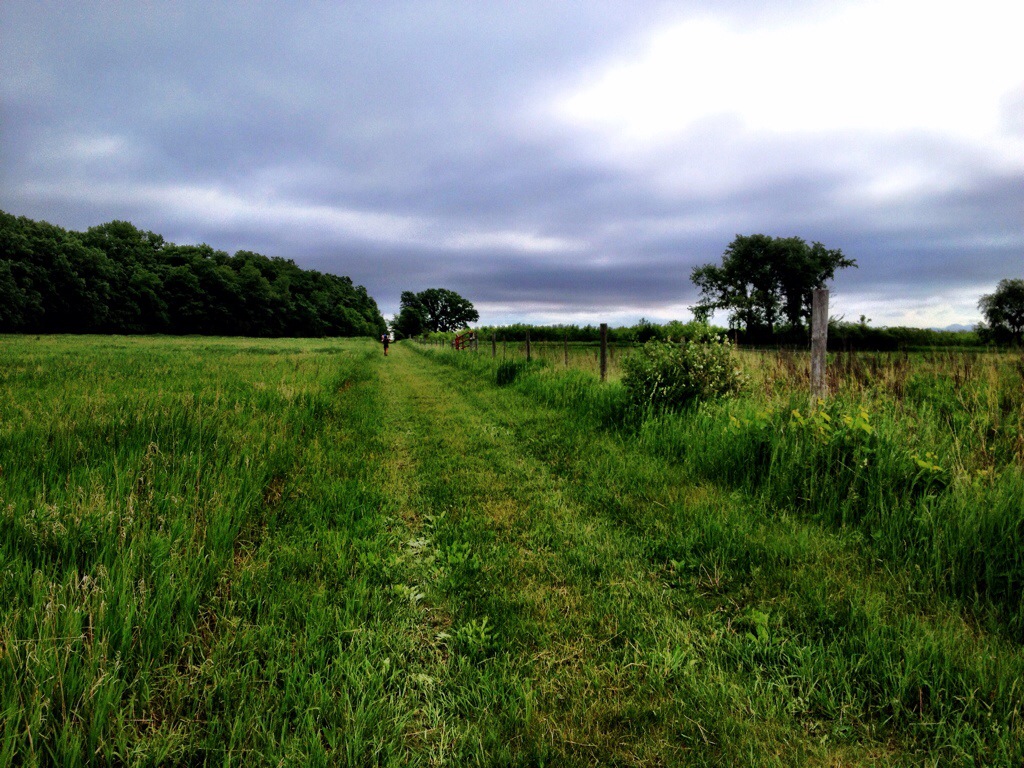 I knew the course was a three loop mix of terrains, but hadn’t really spent a ton of time researching the course. The first few miles took us through a meadow like area. Meadows are my least favorite to run on because the ground is uneven and grass can hide this. Later in the day the sun also shines bright in an open meadow. Lucky for us that the biggest section of meadow was early on. Thank you race director! We then headed on a gravel road that led to a wood chip trail and then a packed dirt and grass trail. The woods were so beautiful.
