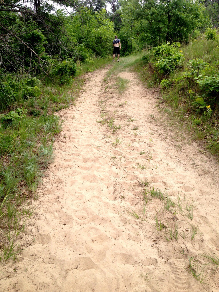 After the woods we headed out to another meadow section that included a sandy hill before heading back into the woods. Half of it is below. My hill strategy was to walk hills that were longer than ten feet. Most runners were walking hills to preserve their legs, too. In the words of a man on the course “I surrender to the hills.” Being a new trail runner I didn’t need to run a chain of mountains; these hills were enough but doable at the same time.