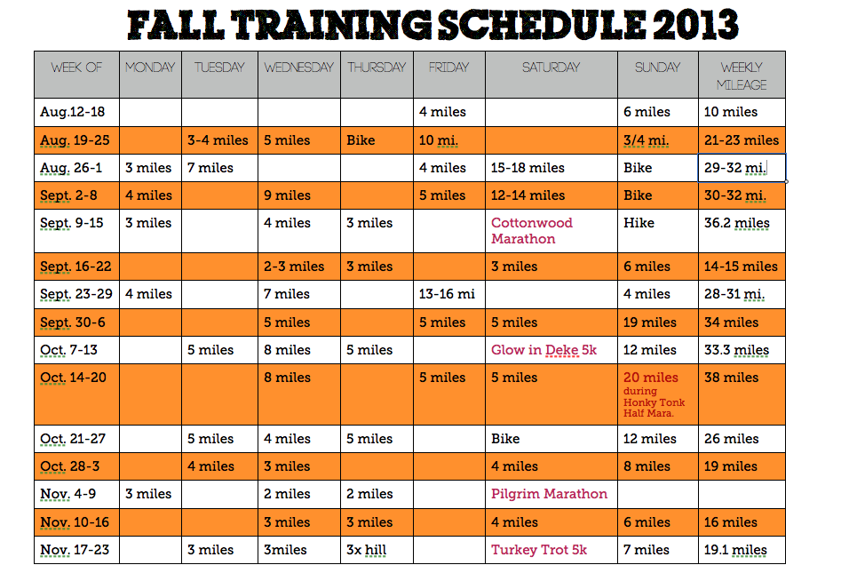 I’ve come to terms that my original PR goal for the Big Cottonwood Marathon in Utah won’t be happening. Is this training plan anything like my previous one…NO! Am I 100% I can do this plan with the ankle…NO! Am I going to try…YES! I’m going to run easy and what I can for a couple weeks building my miles back up so I can finish this race. With coaching high school cross country (assistant) and team dinners each week, I will only be planning to run four days. This will also give me more rest days to rest, ice, and monitor the ankle. You’ll notice biking made it on the schedule. I plan to bike one day per week or in place of runs if needed. Some days will go as planned. Others will be a wreck I’m sure!