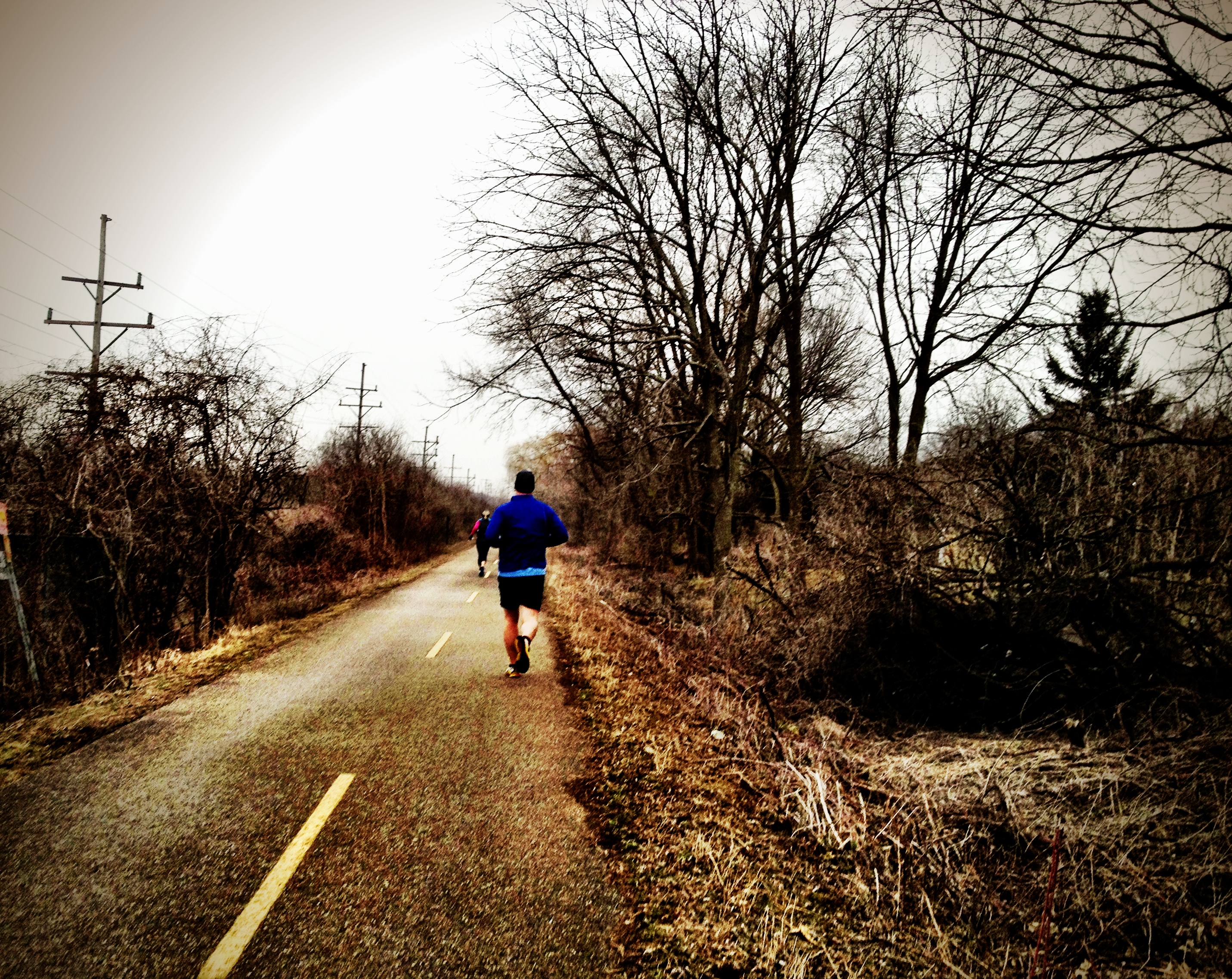 At mile 11 we got on Hagen-Burke Trail which then met up with the Monon Trail. I love running bike paths and rail trails, so this gave me an uptick in my moral and the tree cover made me forget about the rain some. I ran past a sign that said mile 25. I thought about how I might feel at mile 25. No matter how a race is going that last mile doesn’t ever really feel good. It’s a place of pain, excitement, exhaustion and emotion. It’s complicated to explain until you experience it.